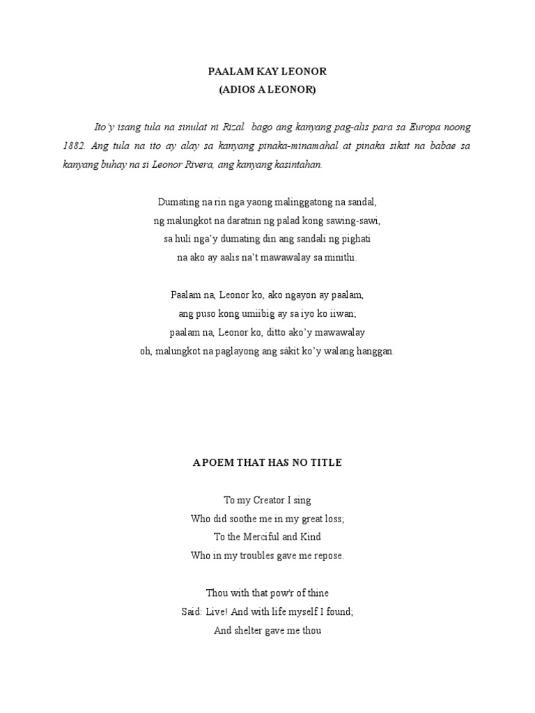 Mga Tula Ni Jose Rizal Poems Of Rizal English Tagalog