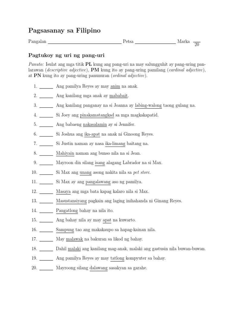 Some of the worksheets displayed are Pagsasanay sa filipino Pagsasanay sa filipino Uri ng mga salita ayon sa kayarian Kaantasan ng pang uri 6 work Talata gamit ang pang uri Filipino Filipino baitang 3 ikatlong markahan Pagbuo ng salita.