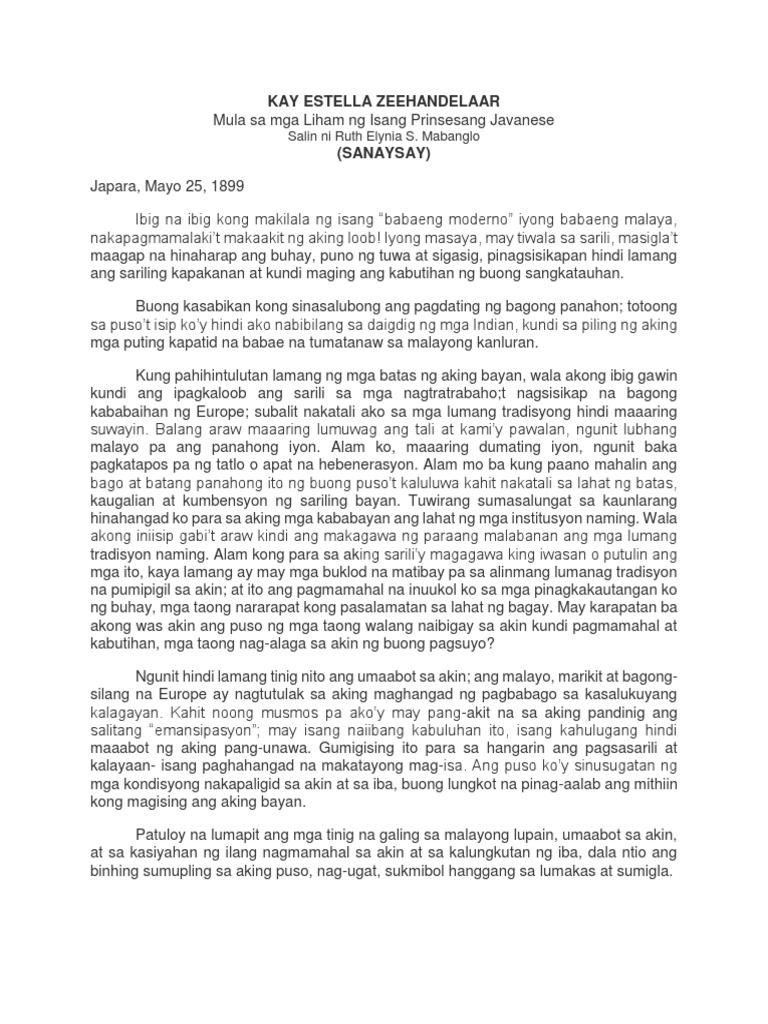 Kay estella zeehandelaar. Mula sa mga Liham ng Isang Prinsesang Javanese Japara mula sa Indonesia na isinalin sa Filipino ni Ruth Elynia S. Sagutin ang sumusunod na katanungan.