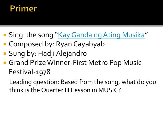 Kay Ganda ng Ating Musika Alikabok Spolarium. At sa habang buhay magiging atinIt never gets old OPM hitmaker Hajji Alejandro told ABS-CBN News when asked about his iconic song Kay Ganda ng Ating Musika that won for him and its composer National Artist for Music Ryan Cayabyab the grand prize in the first Metro Manila Popular Music Festival back in 1978Alejandro in fact has been constantly singing Kay Ganda ng Ating. He could be a Filipino artist composer and conductor.
