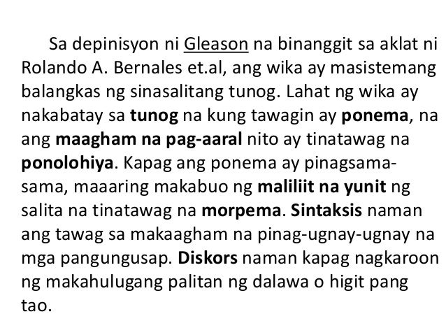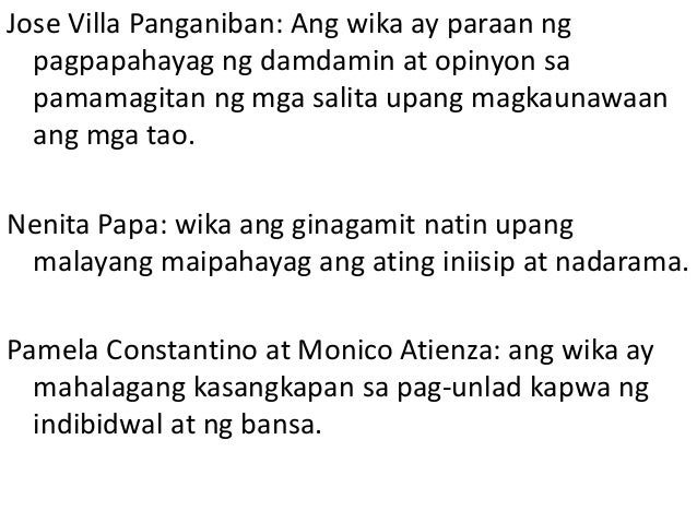 Ang wika ayon kay Jose Villa Panganiban leksikograpo at lingguwista ay paraan ng pagpapahayag ng damdamin at opinyon sa pamamagitan ng mga salita upang magkaunawaan ang mga tao. Ayon kay Almario ang wika ng bayan ay kung ano ang kaalaman at kasanayan ng bayan. Ipaliwanag ang kahulugan ng wika ayon kay Henry Gleason.