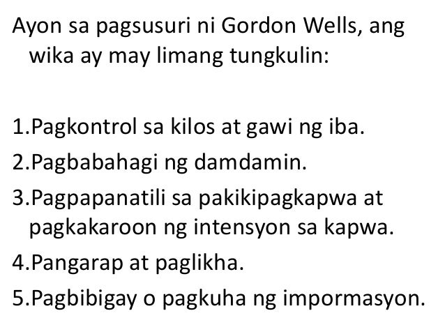 Ayon kay Sapir ang wika ay isang instrumento o kasangkapan ng sosyalisasyon. 1Pagpapahayag ng Damdamin Emotive 2Panghihikayat Conative 3Pagsisimula ng pakikipag-ugnayan Phatics 4Pag-gamit bilang sanggunian Referential 5Pagbibigay kuro-kuro Metalingual. Ang wika ay may ibat ibang gamit sa lipunan na nakatutulong sa tao upang makipag-ugnayan sa.