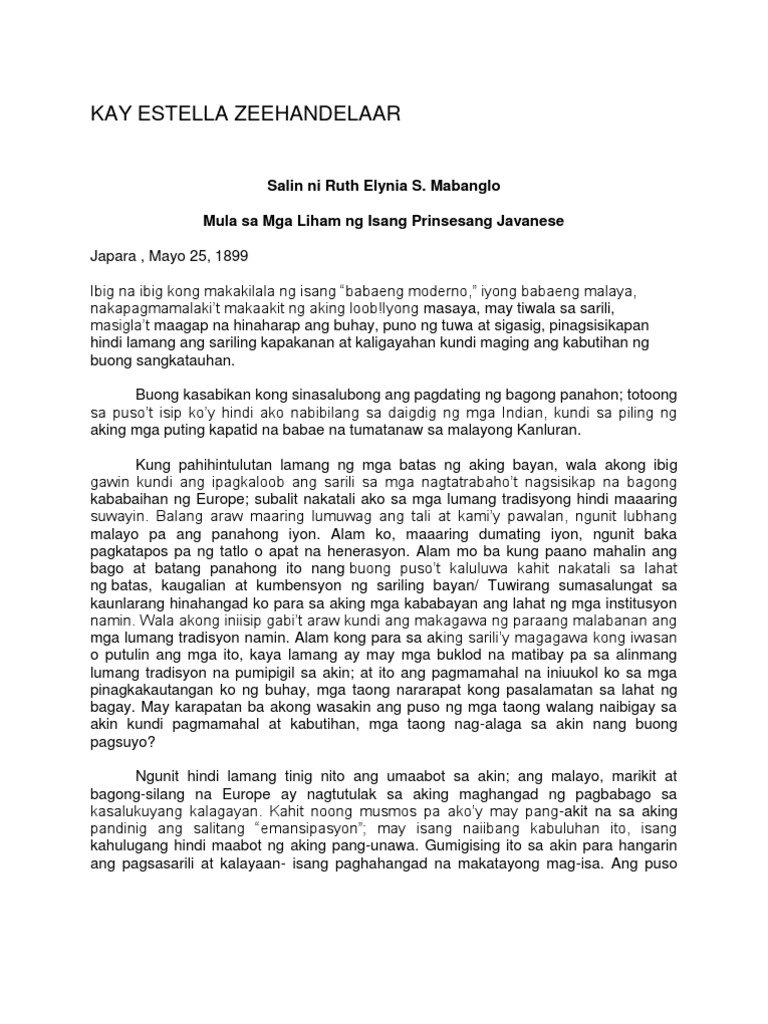 Salin ni Ruth Elynia S. 9 filipino lm q1 1 pin. Si Estella Zeehandelaar ay isang manunulat na tubong Indonesia na sumulat ng isang lathalain ukol sa kaugaling Javanese na kanyang kinalakihan.